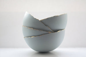 Geometric faceted polyhedron bowl in sky blue made from stoneware Parian porcelain with real gold finish - geometric decor  - Regular price