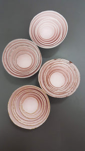 Set of 7 stoneware fine bone china nesting bowls in dusty pink and white with various finishes.