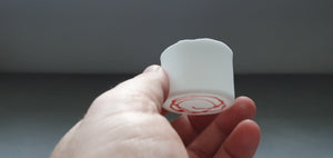 Small snow white round cup made from English fine bone china and hidden red enamel design underneath - geometric decor one of a kind