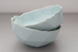 Geometric faceted polyhedron bowl in sky blue made from stoneware Parian porcelain with real gold finish - geometric decor