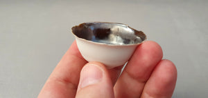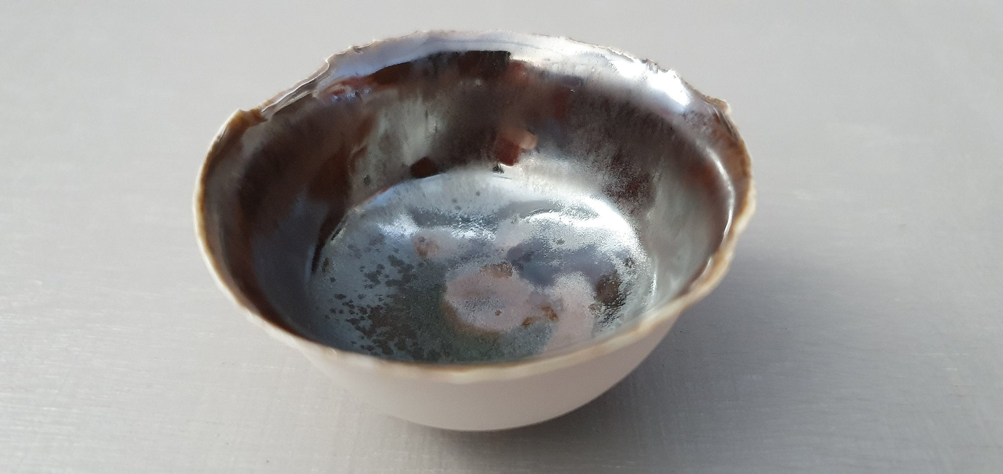Very thin and delicate with organic rims and dark brown almost black glazed interior.